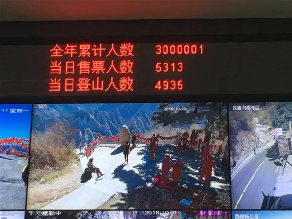 在全國(guó)慶祝改革開放40周年之際,10月29日11時(shí),華山景區(qū)迎來(lái)了今年購(gòu)票登山人數(shù)300萬(wàn)人次的歷史性時(shí)刻。