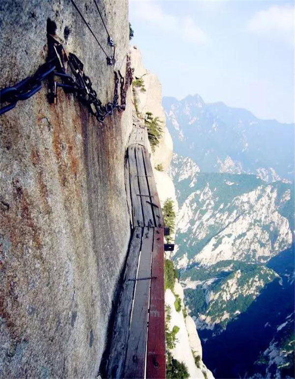 西岳華山歷來(lái)被認(rèn)為是五岳之中最為險(xiǎn)峻的,而在華山中,險(xiǎn)中之險(xiǎn)莫過(guò)于“長(zhǎng)空棧道”和“鷂子翻身”。特別是具有700多年歷史的長(zhǎng)空棧道,在華山南峰東側(cè)山腰的萬(wàn)仞絕壁上鑿出來(lái)的幾個(gè)踏腳之處,鑲嵌石釘搭木椽搭建了一個(gè)百余米懸空的棧道,讓人望而卻步,如果你有恐高癥,僅僅看一眼都會(huì)讓你驚恐萬(wàn)分。2013年,著名旅游網(wǎng)站“Smarter Travel”盤(pán)點(diǎn)全球最恐怖懸崖步道,將華山長(zhǎng)空棧道列為全球十大最恐怖的懸崖步道之一。