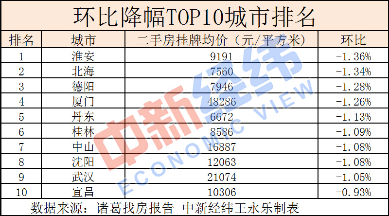 數(shù)據(jù)顯示,淮安(-1.36%)、北海(-1.34%)、德陽(yáng)(-1.28%)、廈門(-1.26%)、丹東(-1.13%)、桂林(-1.09%)、中山(-1.08%)、沈陽(yáng)(-1.08%)、武漢(-1.05%)、宜昌(-0.93%)為環(huán)比跌幅TOP10城市。