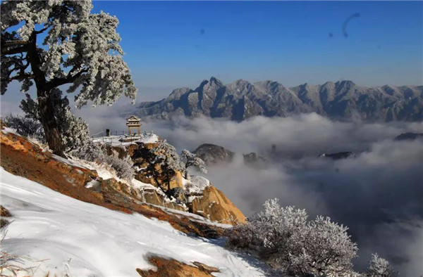 華山在11月下旬進(jìn)入冬季,12月至次年3月是華山雪季。游客可欣賞到難得一見的華山雪景——美麗的霧凇給樹木、巖石、屋舍都披上一層晶瑩的薄衣,尤其在大雪覆蓋后,山景變成一幅曼妙的白色圖畫,峰上的樹木和古藤被透明的冰層包裹,極富魅力。