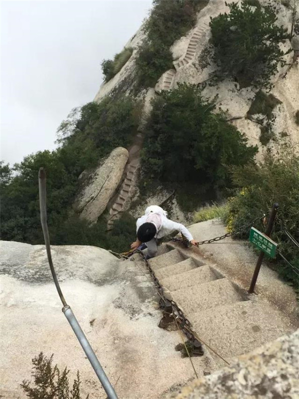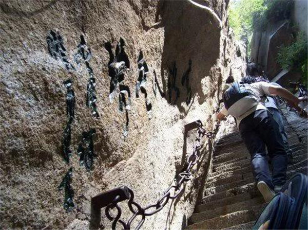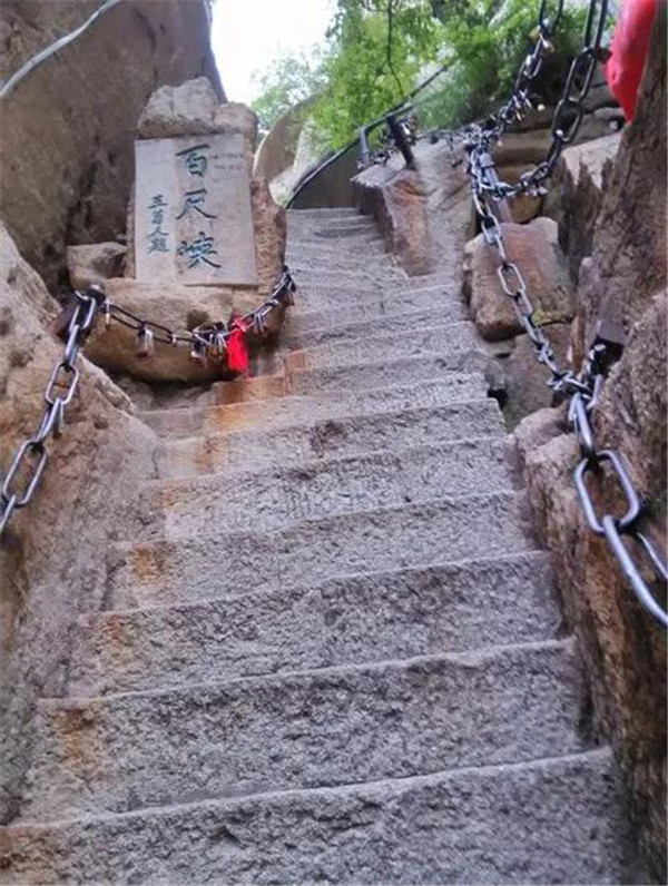 千尺幢位于回心石之上,是華山第一險(xiǎn)境。山幢壁直立,其間僅容二人上下穿行。兩邊鐵鏈垂直下垂,坡度為70°。從上到下共有370多個(gè)臺階,皆不滿足寬。