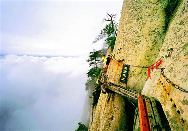 長空棧道位于南天門外,是華山著名險(xiǎn)道之首。棧道分三段:南天門石坊至朝元洞西,路依崖鑿出,長20米,寬二尺許,為上段。折而下,崖隙橫貫鐵棍,形如凌空懸梯,游人須挽索逐級而下,稱之“雞下架”,是為中段。再西折為下段,筑路者在峭壁上鑿出石孔,楔進(jìn)石樁,石樁之間架木椽三根,游人至此,須面壁貼腹,腳踏木椽橫向移動前行。