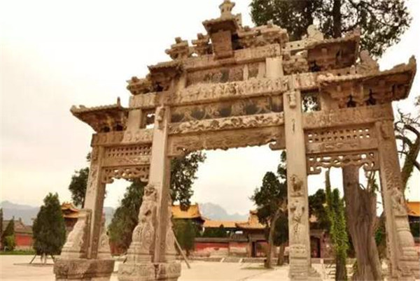 “天威咫尺”石牌樓明萬(wàn)歷年所建,結(jié)構(gòu)為四柱三開間五樓式金青石牌樓。結(jié)構(gòu)精巧,內(nèi)容豐富,雕刻手法細(xì)致、全面。運(yùn)用圓雕、浮雕、線雕、透雕等各種雕刻手法。