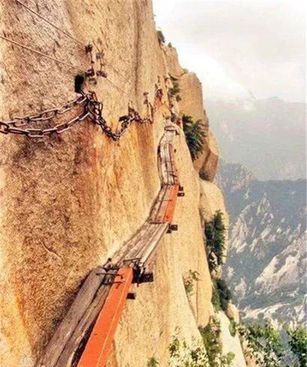 長(zhǎng)空棧道位于華山南峰東側(cè)山腰,在約2160米垂直的崖壁上鑿洞、插楔、鋪板搭制而成的“長(zhǎng)空棧道”,腳下便是萬(wàn)丈深淵,勇敢的人如履平地,稍畏懼者便是膽戰(zhàn)心驚,屏氣挪步。