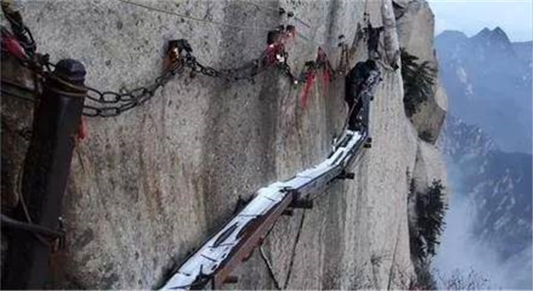 長空棧道,可謂華山險道之首,它猶如一道奇異的仙練鑲嵌在南峰絕壁。明代“后七子”之一的李攀龍《太華山記》載:“出南天門向西就是棧道,棧雖有銅柱鐵索攔護,然闊不盈尺。行二十余丈方至盡頭。下折為井,高約三丈,旁出復(fù)為棧……”置身其中,只覺背空腳虛,發(fā)豎氣閉,寒風沖襠,骨松筋緊,膽大者有凌空欲飛之感,膽弱者心生抵近鬼門之憂。多少年來“長空棧道”以它特有的絕險情懷召喚著天下英雄豪杰一試身手,體驗驚心動魄,揮灑豪邁人生。