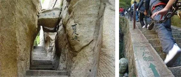 千尺幢,是經(jīng)華山峪登主峰的必經(jīng)之道。這里原為一崖間裂隙,直立70度,后來人們沿隙鑿?fù)爻陕?,有石階370級,階寬僅容半足,游人登臨時,仰視一線天,俯視若臨深井。百尺峽在“千尺幢上,也是巖隙險道,有石階91級,游人須挽索而上。有詩云:“幢去峽復(fù)來,天險不可瞬,雖云百尺峽,一尺一千仞”。