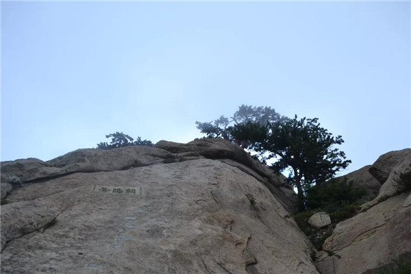 我和孩子抓緊時(shí)間往東峰趕,經(jīng)紫氣臺(tái)、二仙坎,攀爬一道石梁前往東峰山門(mén)。此時(shí)飄來(lái)小雨點(diǎn),我們顧不得腳下濕滑加快了腳步。經(jīng)鷂子翻身,孩子想要征服天險(xiǎn)的念頭依然強(qiáng)烈,一心想翻鷂子翻身,后因人多需排隊(duì)等候而暫時(shí)放棄。東峰又叫朝陽(yáng)峰,朝陽(yáng)臺(tái)是觀日出的勝地。我倆左轉(zhuǎn)攀爬朝陽(yáng)臺(tái),雨漸漸大起來(lái)。至臺(tái)頂,方舉目四顧,黃豆大小的密集雨點(diǎn)劈頭蓋臉砸下。朝陽(yáng)臺(tái)上沒(méi)有看到太陽(yáng),卻遭遇暴雨,我們狼狽撤離朝陽(yáng)臺(tái)。