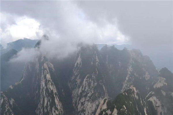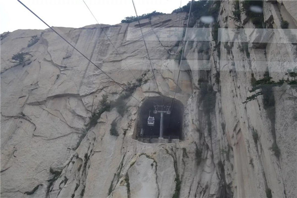 現(xiàn)在爬華山可不是“自古華山一條道”了,我們選擇坐西峰索道纜車,凌空飛渡千山萬(wàn)壑。說(shuō)是千山萬(wàn)壑,其實(shí)華山是由一塊完整碩大的花崗巖石體構(gòu)成的?!渡胶=?jīng)》記載:“太華之山,削成而四方,其高五千仞,其廣十里。”真的很難想像,這么連綿起伏、巨大的山體,其實(shí)是一個(gè)群峰競(jìng)秀的整體。華山,就是這么神奇!