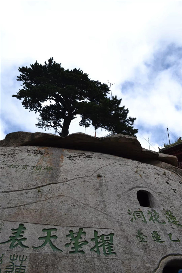 經(jīng)煉丹爐、孝子峰,云霧悄悄退隱,我們向南峰頂挺進(jìn)。南峰蒼翠秀麗,沿途的華山松千姿百態(tài),引人注目。華山迎客松生長(zhǎng)于懸崖峭壁的石縫中,向懸崖一側(cè)伸出虬勁的枝干,就像好客的秦人伸出有力的大手歡迎遠(yuǎn)道而來(lái)的客人。虬枝龍形的枝干上,是綠意盎然的松針,根根好像要刺破天穹。華山迎客松在藍(lán)天白云的映襯下,仿如碧玉雕琢而成,綠的耀眼,秀挺卓然!