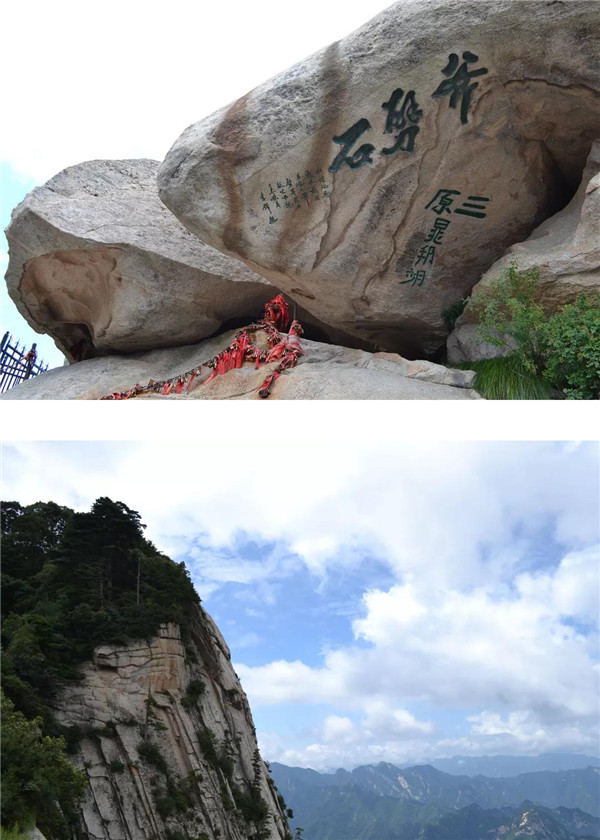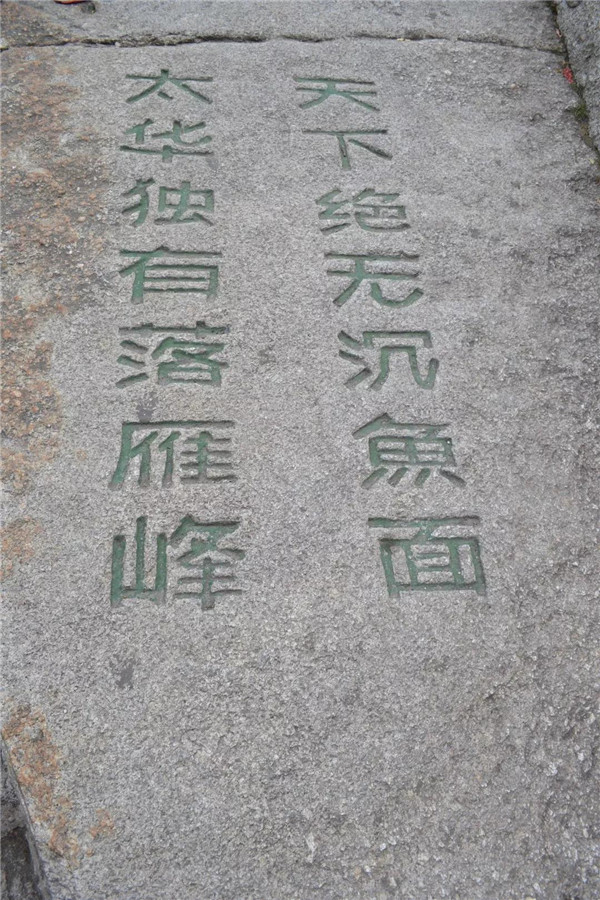 在南峰頂,孩子看到“天下絕無(wú)沉魚(yú)面,太華獨(dú)有落雁峰”的題刻,打趣我:“媽媽,你叫鴻雁,這里又叫落雁峰,真是和你有緣呢!快來(lái)這塊大石頭上落落腳,歇一歇!”“好?。≡蹅z都爬累了,都歇一歇!”我為孩子的體貼欣慰!