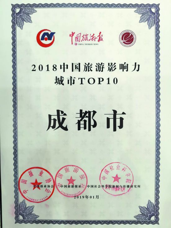 經(jīng)文化和旅游部批準(zhǔn),1月23日,以“新時(shí)代新視野新傳播新動(dòng)能”為主題的2019中國旅游產(chǎn)業(yè)發(fā)展年會(huì)在京舉辦。文化和旅游部黨組成員、故宮博物院院長單霽翔作了《文旅融合的故宮實(shí)踐》主題演講,文化和旅游部黨組成員王曉峰作主旨講話,人民日報(bào)社原副社長、中國報(bào)業(yè)協(xié)會(huì)理事長張建星致辭。在2018年中國旅游產(chǎn)業(yè)影響力風(fēng)云榜的評選中,成都入選“2018中國旅游影響力城市TOP10”,一同入選的還有北京、杭州、蘇州、廣州等城市。此外,都江堰市入選“2018中國旅游影響力區(qū)縣TOP10”。