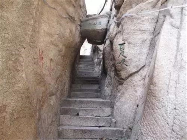 “千尺幢”在華山峪古道“回心石”上,是經(jīng)華山峪登主峰的必經(jīng)之道。這里原為一崖間裂隙,直立70度,后來人們沿隙鑿?fù)爻陕罚惺A370級,階寬僅容半足,游人登臨時(shí),仰視一線天,俯視若臨深井。