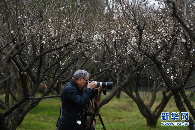 2月17日,攝影愛好者在杭州西溪濕地國家公園拍攝梅花。