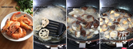主料:雞翅中6個(gè) 大蝦6個(gè) 木耳60克 藕100克 豆皮100克 青筍200克 鮮香菇100克 西蘭花100克 菜花100克 金針菇1小把