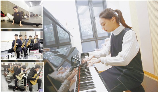 在浙音??嫉娜兆?,能很容易分辨出這些不同專業(yè)的學生。背著大包小包各種形狀樂器的,通常是器樂演奏專業(yè)的考生;舞蹈專業(yè)的女生大多梳著丸子頭,就算穿著臃腫的羽絨服,還是老遠就能看到她們筆挺的腰,給她們服務的師兄師姐,也是整個校園里顏值最高的群體。