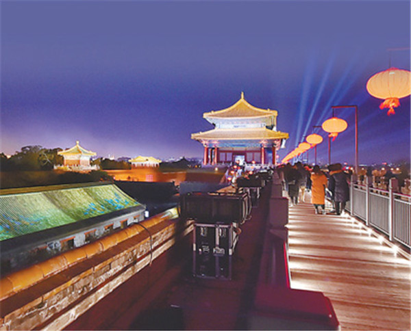 觀眾入場前,可觀賞午門城樓及東、西雁翅樓在燈光映照下的壯美雄姿。自午門入場后,首先觀賞點亮后的太和門廣場,隨后由午門西馬道登午門城樓,參觀“紫禁城里過大年”展覽,在東雁翅樓欣賞中央民族樂團琵琶演奏家趙聰及其團隊的演奏。結(jié)束午門展廳參觀后,觀眾沿著由紅燈籠點綴的城墻步行至東南角樓,觀看虛擬現(xiàn)實影片《角樓》,隨后來到東華門城樓,參觀“營造之道——紫禁城建筑藝術(shù)展”。當走過近千米長的布滿紅燈籠的故宮東城墻時,可以看到臨近城墻西側(cè)的部分古建筑也被點亮,聆聽暢音閣戲樓傳來的戲曲聲。到達東北角樓后,觀眾步行至神武門,在這一區(qū)域可以觀賞到城墻南北兩側(cè)通過藝術(shù)燈光投影于建筑屋頂上的《千里江山圖》等作品,從而產(chǎn)生人在畫中游的感覺。離開神武門城樓后,神武門外東、西兩側(cè)的角樓餐廳和角樓咖啡靜候光臨,從而結(jié)束此次“上元之夜”文化活動。