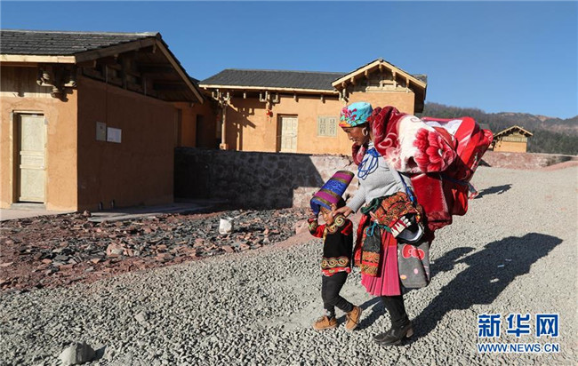 在昭覺(jué)縣三河村易地扶貧安置點(diǎn),馬海阿依帶著女兒搬進(jìn)新居(2月11日攝)。2月11日,三河村首批29戶(hù)、168人告別居住多年的土坯房,搬入易地扶貧安置點(diǎn)的新家。新華社記者 江宏景 攝