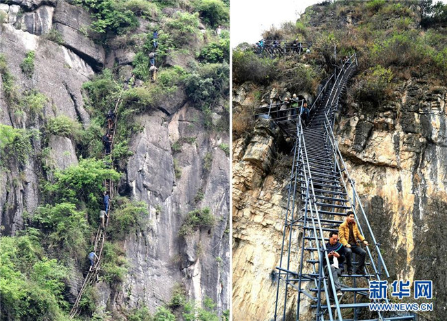 這是通往四川省涼山州昭覺(jué)縣阿土勒爾村的扶梯(左圖攝于2016年5月14日,右圖攝于2017年12月5日)。新華社發(fā)(阿克鳩射 攝)