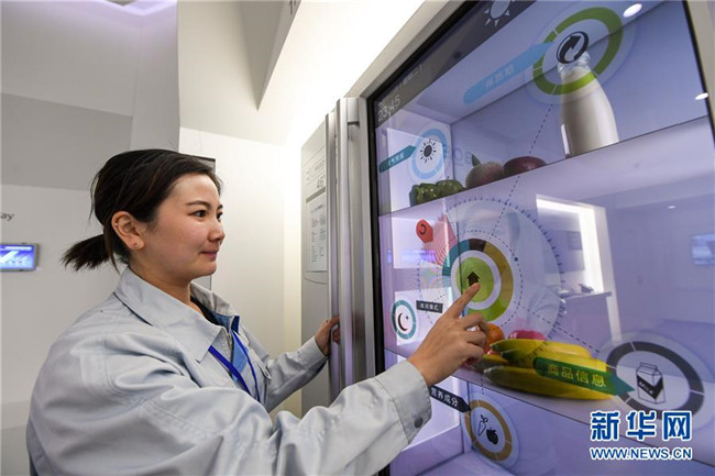 2月22日,在位于內(nèi)蒙古鄂爾多斯市東勝區(qū)的京東方鄂爾多斯AM——OLED顯示器項(xiàng)目中,工作人員在展示運(yùn)用了透明顯示技術(shù)的智能冰箱。 新華社記者 彭源 攝