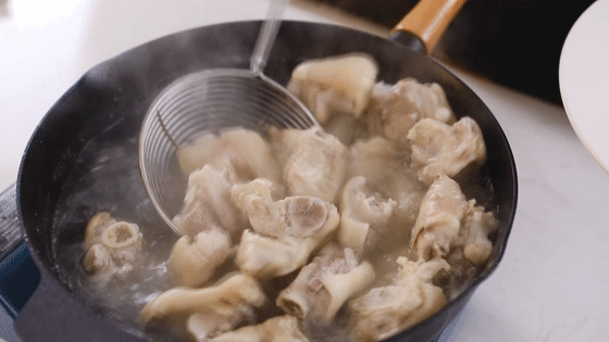 1.豬蹄洗凈,剁成塊;鍋中加入冷水,下入豬蹄、姜片、料酒。