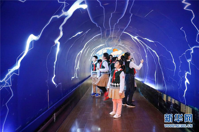 3月22日,學(xué)生在合肥市氣象科普館體驗(yàn)?zāi)M的雷電場(chǎng)景。