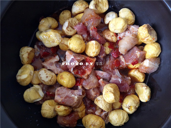 5.將豬肉、板栗放入電燉鍋,攪拌均勻后,倒入適量料酒;