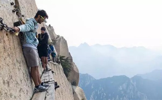What could possibly go wrong? The tourists trek thousands of feet up a Chinese mountain along wooden boards that were nailed together 700 years ago.