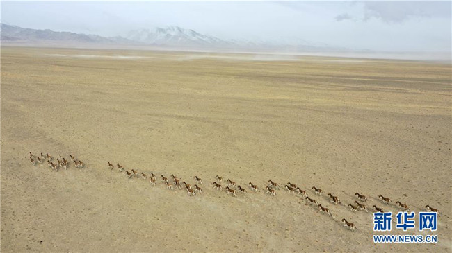 阿爾金山國家級自然保護區(qū)內(nèi)的藏野驢(4月2日無人機拍攝)。 新華社記者 胡虎虎 攝
