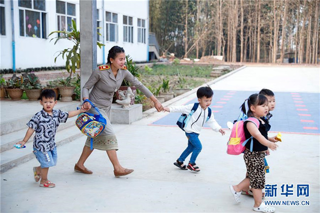 3月22日,在老撾孟賽的中老友誼學校,一名老師將幼兒園的學生送出校門。新華社記者 王婧嬙 攝