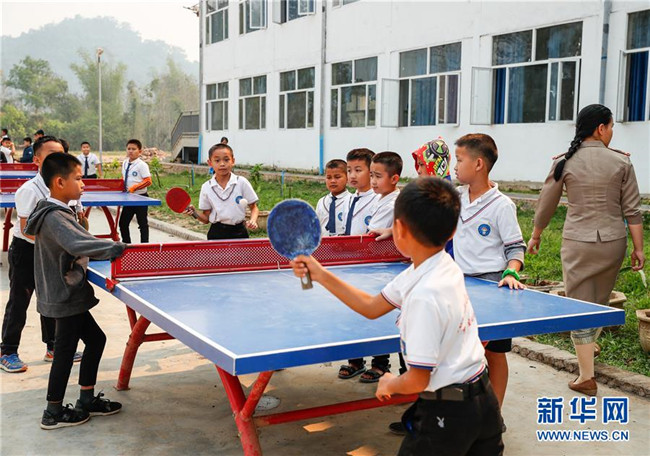 3月22日,在老撾孟賽的中老友誼學校,學生在課間休息時打乒乓球。新華社記者 王婧嬙 攝