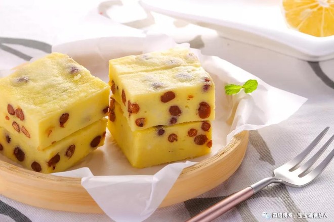 12.最后將山藥糕切成小塊,切好后一粒粒的紅豆浮在表面,紅黃搭配看著就很有食欲。