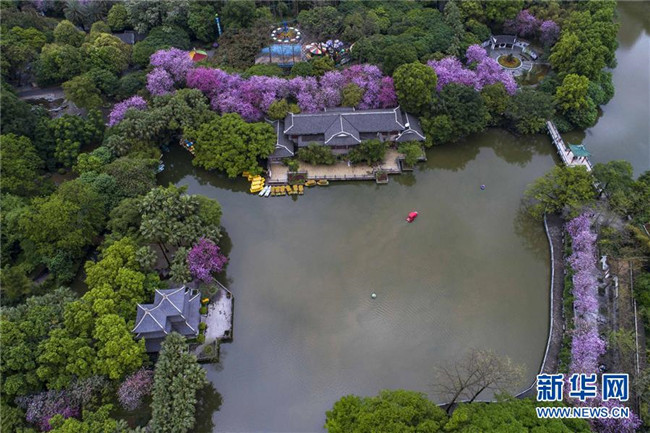 4月14日,在廣西柳州市柳侯公園,盛開的洋紫荊把公園裝扮得格外美麗(無人機拍攝)。