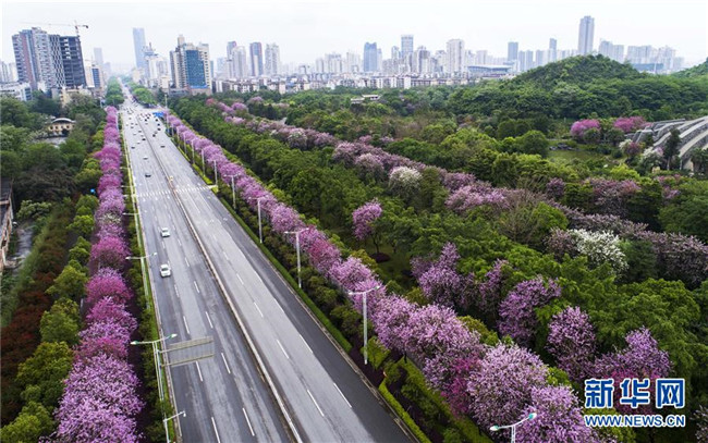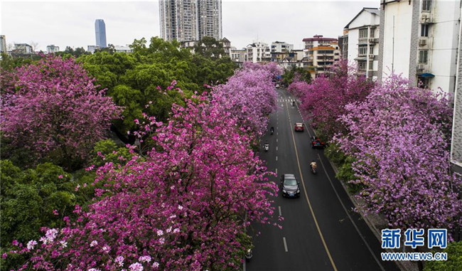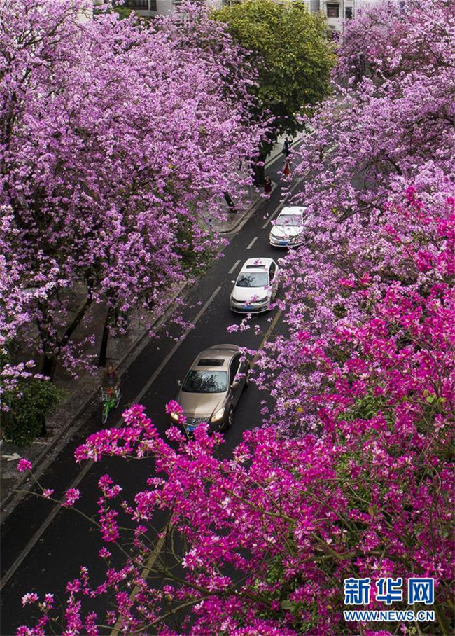 當日,一場大雨過后,廣西柳州市內的洋紫荊開得格外嬌艷。時下,柳州市區(qū)27萬株洋紫荊進入盛花期。 新華社記者 黃孝邦 攝
