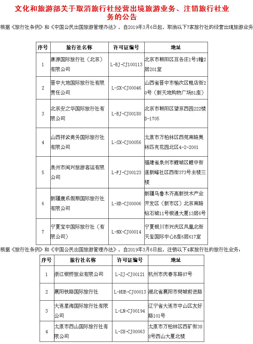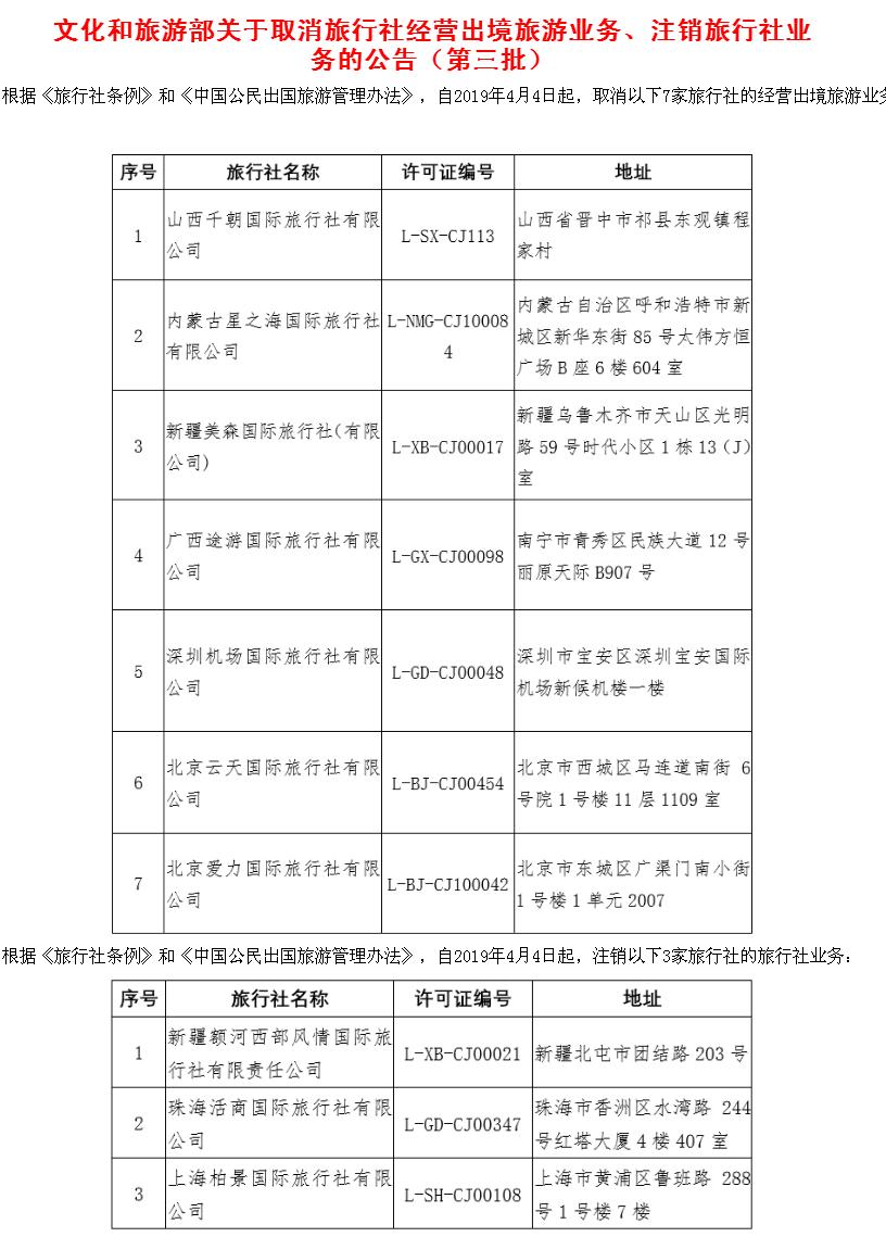 文化和旅游部近日發(fā)布公告,取消7家旅行社的經(jīng)營(yíng)出境旅游業(yè)務(wù),注銷(xiāo)3家旅行社的旅行社業(yè)務(wù)。記者注意到,截至目前,今年文化和旅游部共取消30家旅行社的出境游業(yè)務(wù)、注銷(xiāo)11家旅行社的旅行社業(yè)務(wù)。戳圖看詳細(xì)黑名單。