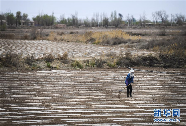 在新疆生產(chǎn)建設(shè)兵團(tuán)第六師共青團(tuán)農(nóng)場(chǎng)的棉花地中,一名農(nóng)場(chǎng)職工在無(wú)人駕駛精量播種機(jī)播種之后的棉田上,檢查地膜表面壓土情況(4月22日攝)。