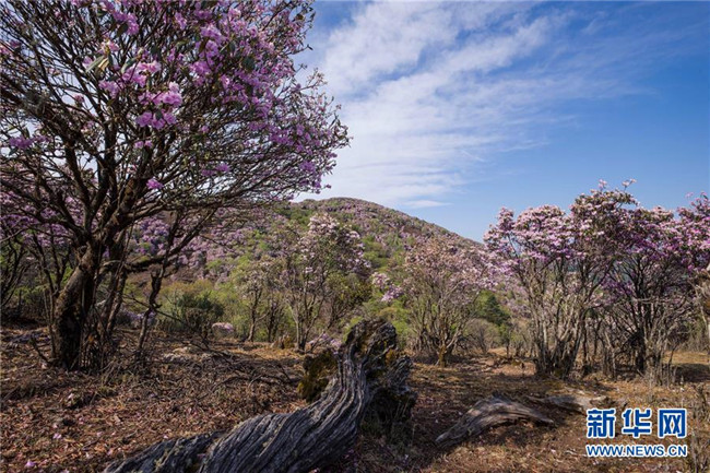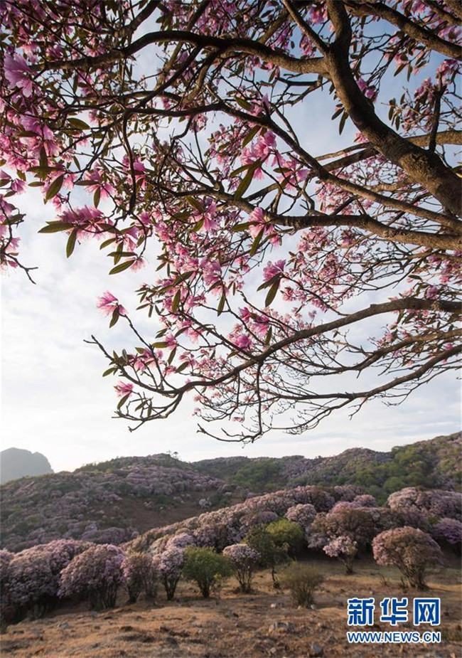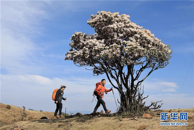4月23日,戶(hù)外愛(ài)好者經(jīng)過(guò)龍頭山野生杜鵑花。 近日,四川省攀枝花市鹽邊縣龍頭山十余萬(wàn)畝野生杜鵑花盛開(kāi),吸引省內(nèi)外游客前來(lái)登山賞花。 龍頭山位于四川省攀枝花市鹽邊縣北部的紅寶苗族彝族鄉(xiāng)境內(nèi),這里的野生杜鵑花花期為2月至5月。 新華社記者 江宏景 攝