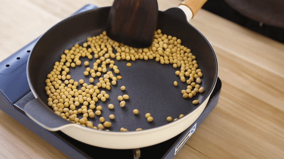 2.開小火炒20分鐘左右至豆香四溢。將炒好的黃豆倒入碗中自然冷卻。(炒過的黃豆出鍋時,小心燙手。)