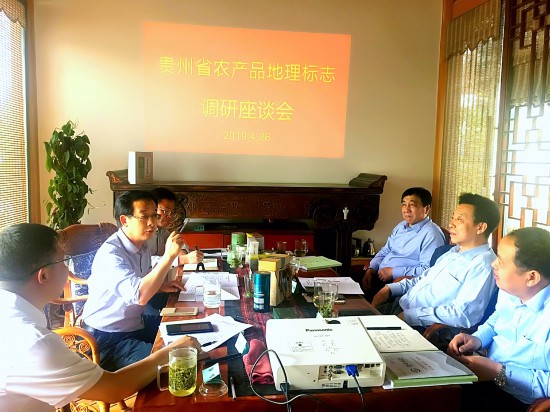 肖榮軍副廳長(左二)在向調(diào)研組一行介紹貴州省農(nóng)產(chǎn)品地理標志相關(guān)情況