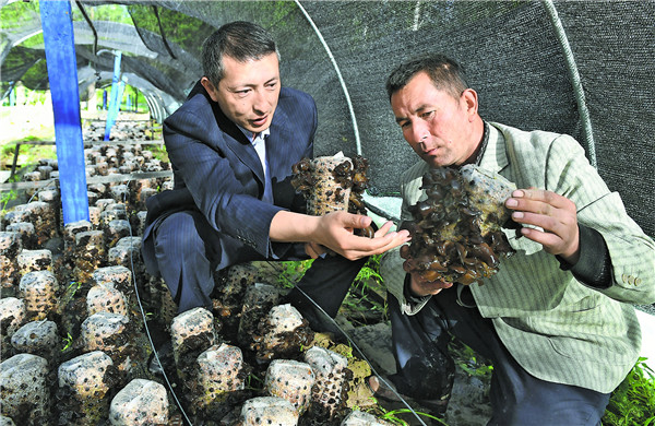 4月30日,新疆烏什縣委組織部駐阿克托海鄉(xiāng)庫木奇吾斯塘村“訪惠聚”工作隊(duì)隊(duì)員艾克熱木·艾麥提(左)在工作隊(duì)建立的黑木耳種植示范基地,為該村貧困戶講解黑木耳種植技術(shù)。約提克爾·尼加提 攝