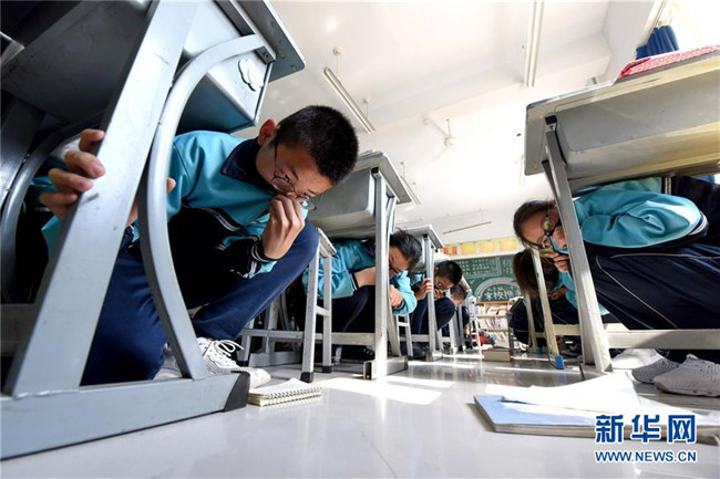 5月12日,邢臺市第八中學(xué)學(xué)生在進(jìn)行模擬防震減災(zāi)演練。新華社記者 朱旭東 攝