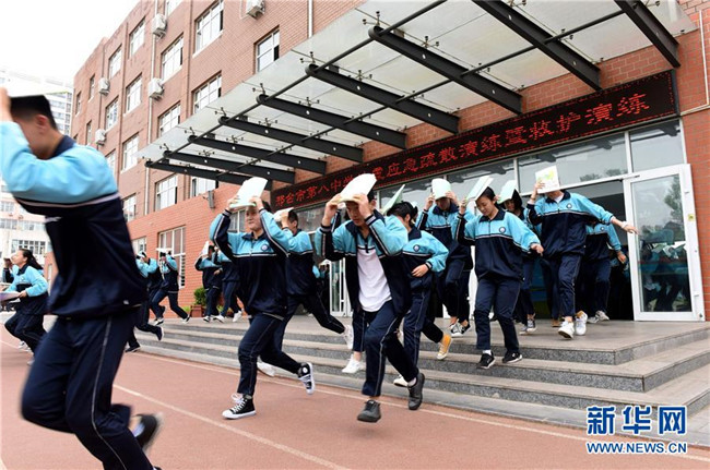 5月12日,邢臺市第八中學(xué)學(xué)生在進(jìn)行模擬緊急疏散演練。新華社記者 朱旭東 攝