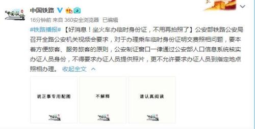 據(jù)中國(guó)鐵路總公司官方微博消息,公安部鐵路公安局召開(kāi)全路公安機(jī)關(guān)視頻會(huì)要求,對(duì)于辦理乘車(chē)臨時(shí)身份證明交費(fèi)照相問(wèn)題,要本著方便旅客、服務(wù)旅客的原則,公安制證窗口一律通過(guò)公安部人口信息系統(tǒng)核實(shí)辦證人員身份,不得要求辦證人員提供照片,更不允許要求辦證人員到指定地點(diǎn)照相辦理。