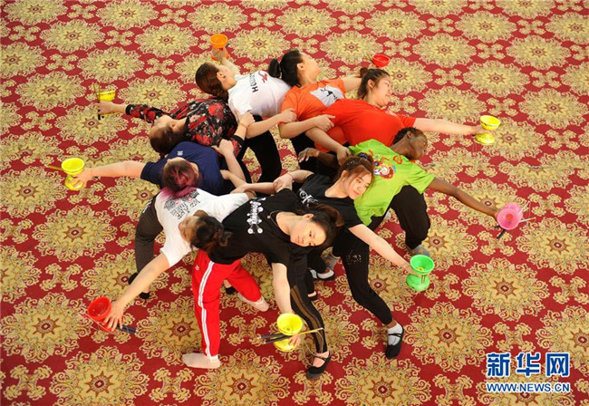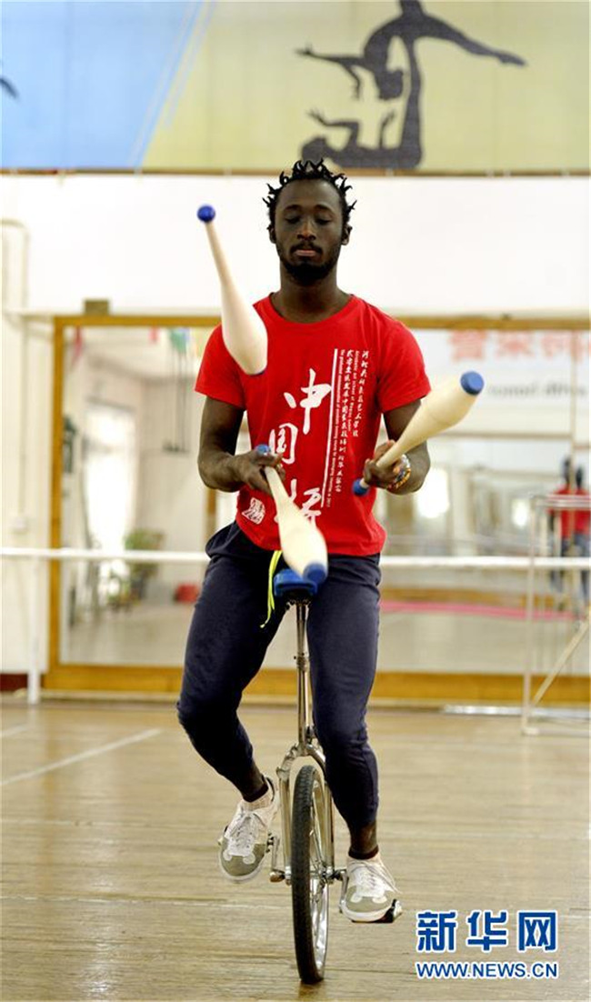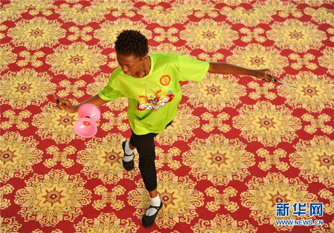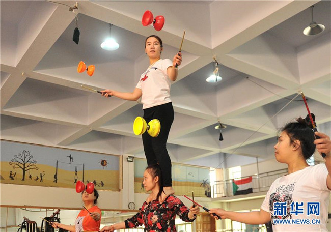 5月20日,在吳橋雜技藝術學校,留學生練習雜技。新華社發(fā)(苑立偉 攝)