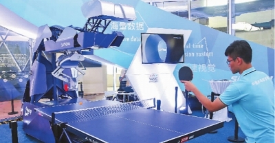 工作人員在2018世界人工智能大會現(xiàn)場演示與機器人打乒乓球。新華社發(fā)