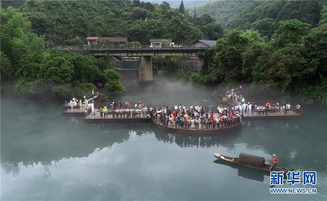 5月25日清晨,一艘小船劃過小東江江面,吸引游人駐足(無人機拍攝)。新華社發(fā)(朱孝榮 攝)