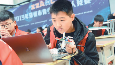 3月31日,2019年鄭州市青少年機(jī)器人競賽首次將線上創(chuàng)意編程比賽納入競賽中。圖為選手在比賽前編程。張 濤攝(人民視覺)