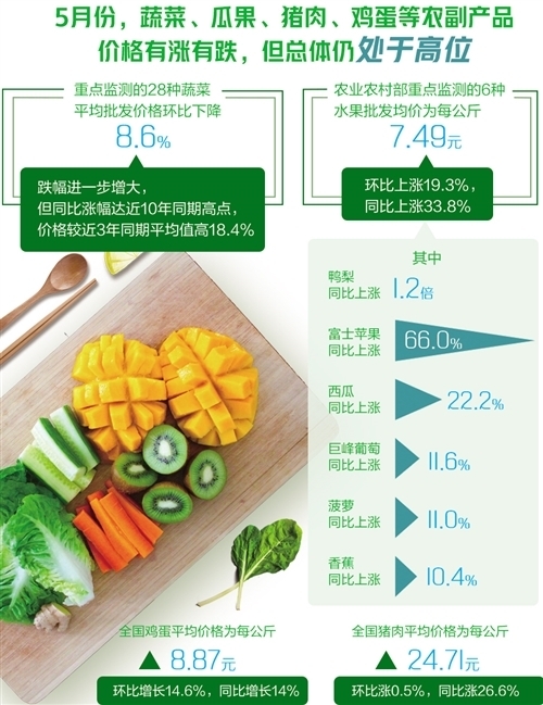 從數(shù)據(jù)來看,雖然5月份蔬菜、瓜果、豬肉、雞蛋等農(nóng)副產(chǎn)品價(jià)格有漲有跌,但總體仍處于高位。