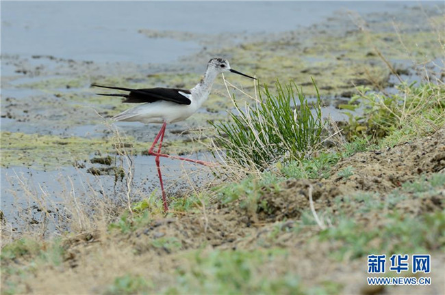 6月9日,一只長(zhǎng)腿鷸在新疆烏倫古湖國(guó)家濕地公園覓食。新華社記者 丁磊 攝