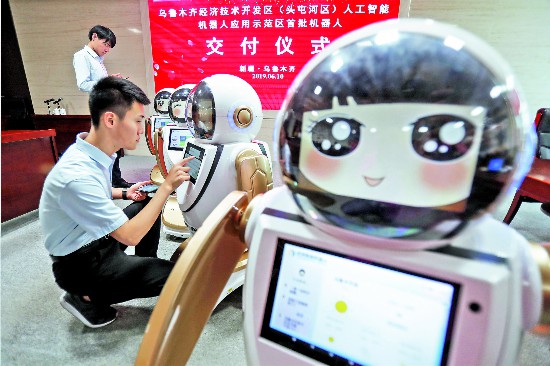 6月10日,在烏魯木齊經(jīng)濟技術(shù)開發(fā)區(qū)(頭屯河區(qū))維泰大廈,新疆創(chuàng)澤機器人科技有限公司工程師在調(diào)試機器人“創(chuàng)創(chuàng)”。 當(dāng)日,該公司生產(chǎn)的75臺人工智能機器人正式交付經(jīng)開區(qū)(頭屯河區(qū))政務(wù)服務(wù)、社區(qū)、學(xué)校等場所,這也標(biāo)志著烏魯木齊經(jīng)開區(qū)(頭屯河區(qū))國家級人工智能機器人應(yīng)用示范區(qū)正式啟動。(謝龍)