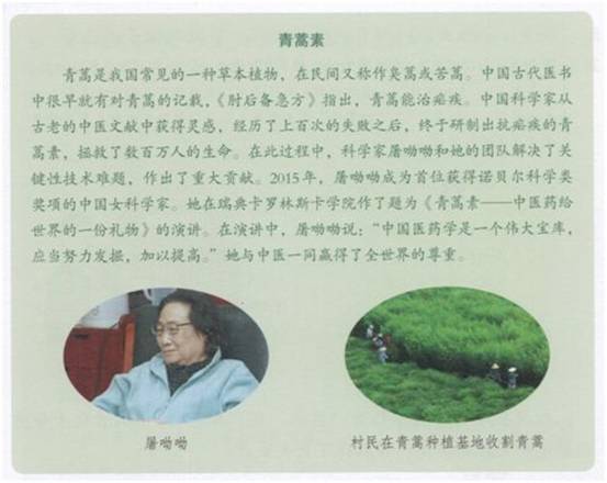 此外,初中歷史教材也在《中國歷史》八年級下冊第18課“科技文化成就”中,對屠呦呦科研團隊先進事跡進行了專題介紹。